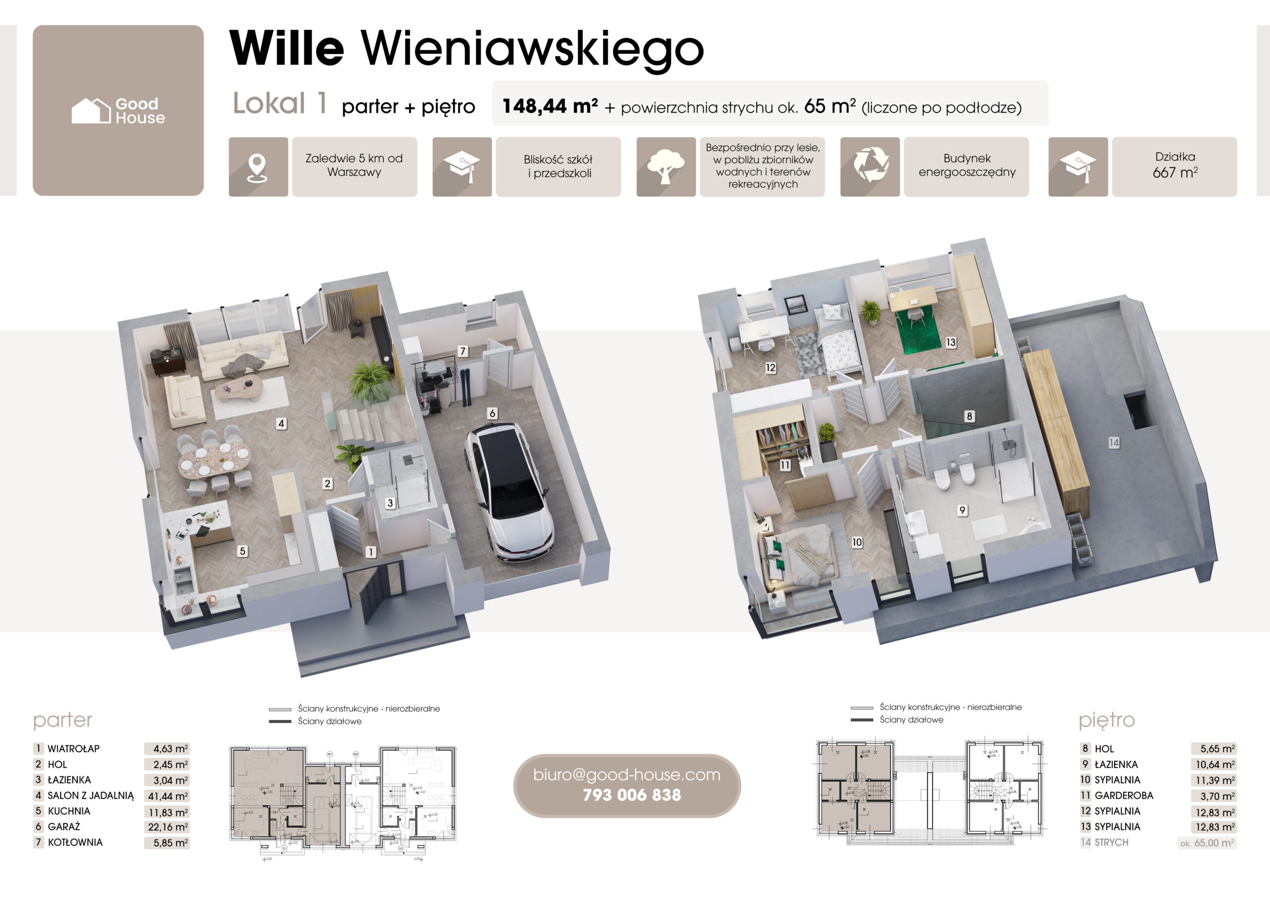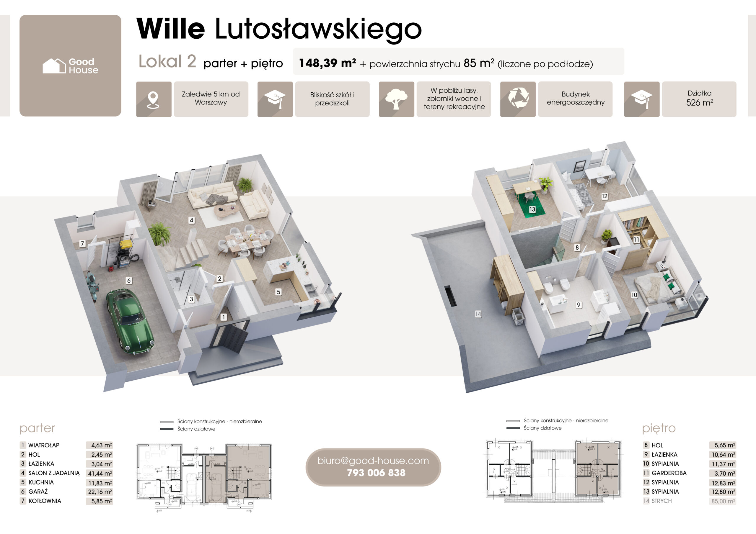 - Połączenie lokali garażami i podwójną ścianą zapewnia ogromny komfort i prywatność.