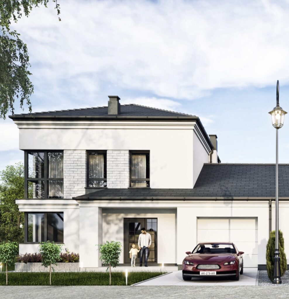 - Poddasze nad garażem z możliwością adaptacji na dodatkowe, funkcjonalne pomieszczenie o wielkości 28 m2 (liczone po podłodze)